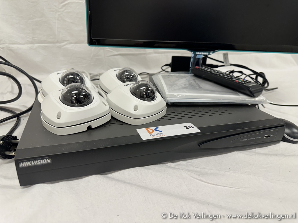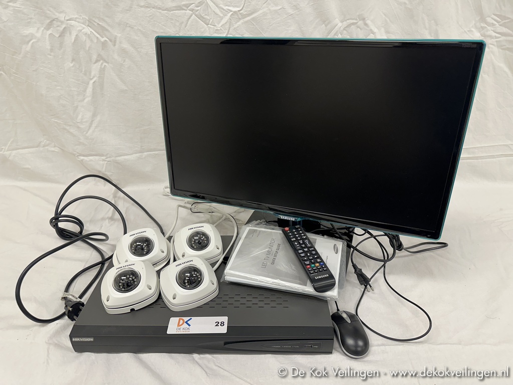 HikVision camerabewakingsysteem, bestaande uit 1x DS-7604NI-SEP 4-poorts camerarecorder met harddisk, 4x DS-2CD2512F-IWS 4mm (+WiFi) minidome bewakingscamera met WiFi en PoE-LAN, inclusief USB-muis en Samsung LT24D390 24" Full-HD LED-televisie, inclusief voedingsadapter, afstandsbediening, HDMI-aansluitkabel en enig toebehoren