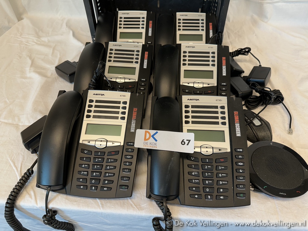Telecomapparatuur, w.o. 6x Aastra 6730i VoIP telefoontoestel, inclusief enige voedingsadapters, 1x Jabra PHS001U USB-tafelmicrofoon en 1x Konftel uitbreidingsmicrofoon, in kunstof stapelkrat
