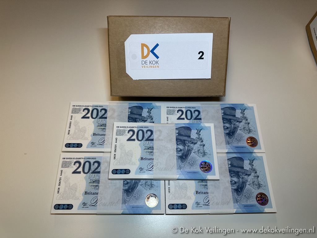 Partij van 499 Britannia Pound Notes (Fantasie Bankbiljet - Fantasy Note) - HM Queen Elizabeth II (1926-2022) - Commemoration 2022 - Serie 44A0 - Gedrukt door Koninklijke Joh. Enschedé (Haarlem) in gelimiteerde oplage van 70.000 stuks - Voorzien van unieke serienummers 006501 tot en met 006999 (zonder serienummer 007000 in doosje) - Veiligheidskenmerken zoals UV-inkt met de heraldische dieren van het Verenigd Koninkrijk - (Retailwaarde van € 9,95 tot € 12,95 per biljet)