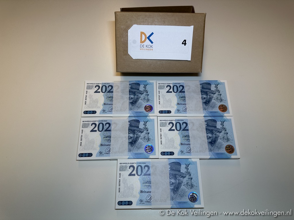 Partij van 499 Britannia Pound Notes (Fantasie Bankbiljet - Fantasy Note) - HM Queen Elizabeth II (1926-2022) - Commemoration 2022 - Serie 44A0 - Gedrukt door Koninklijke Joh. Enschedé (Haarlem) in gelimiteerde oplage van 70.000 stuks - Voorzien van unieke serienummers 007501 tot en met 007999 (zonder serienummer 008000 in doosje) - Veiligheidskenmerken zoals UV-inkt met de heraldische dieren van het Verenigd Koninkrijk - (Retailwaarde van € 9,95 tot € 12,95 per biljet)