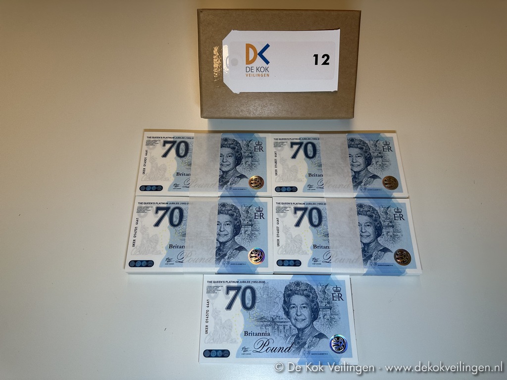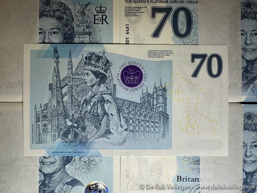 Partij van 414 Britannia Pound Notes (Fantasie Bankbiljet - Fantasy Note) - The Queen's Platinum Jubilee (1952-2022) - 70 EIIR - Serie 44A1 - Gedrukt door Koninklijke Joh. Enschedé (Haarlem) in gelimiteerde oplage van 70.000 stuks - Voorzien van unieke serienummers 014570 tot en met 014590, 014607 tot en met 014999 (zonder serienummers 014501 t/m 014569, 014591 t/m 014606 en 015000 in doosje) - Veiligheidskenmerken zoals UV-inkt met de heraldische dieren van het Verenigd Koninkrijk - (Retailwaarde van € 9,95 tot € 12,95 per biljet)