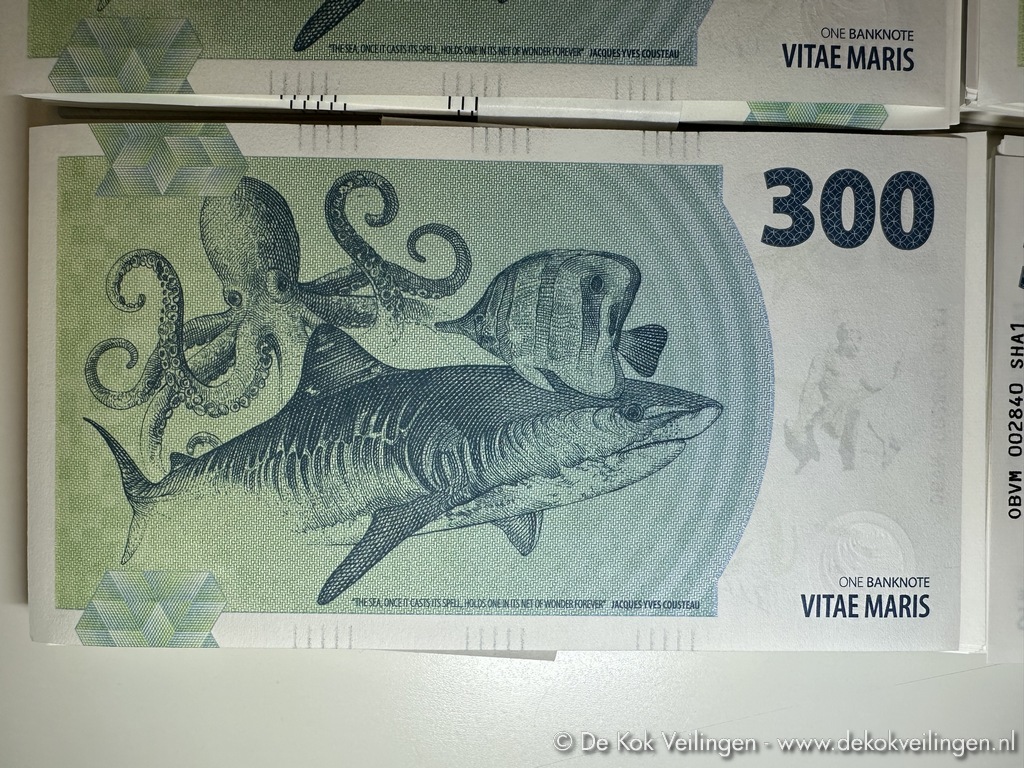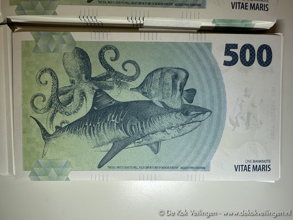 Partij van 61x4 Souvenir note Vitae Maris (Fantasie Bankbiljet - Fantasy Note) - Serie van 4: (OCA1) Octopus (Octopoda), (PGA1) Penguin (Spheniscidae), (SHA1) Shark (Selachimorpha) en (TUA1) Seaturtle (Chelonioidea) - Gedrukt door Koninklijke Joh. Enschedé (Haarlem) in gelimiteerde oplage van 3.000 stuks sets van 4 biljetten in de Vitae Maris Sea Life collectie (Octopus, Penguïn, Shark en Seaturtle) - Voorzien van unieke serienummers 002840 tot en met 002900 (totaal 244 bankbiljetten in doosje) - Veiligheidskenmerken zoals UV-inkt met de heraldische dieren van het Verenigd Koninkrijk - (Retailwaarde van € 30,00 per set)