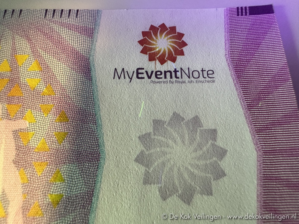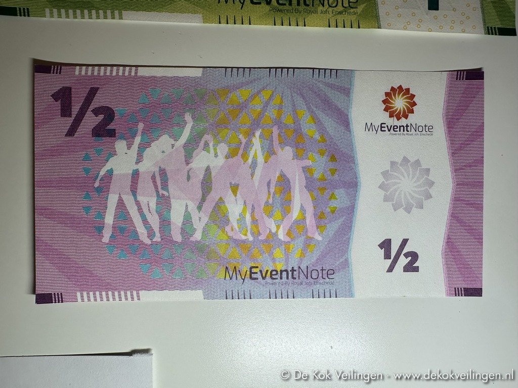 Partijen MyEventNote biljetten (Fantasie Bankbiljet - Fantasy Note) - Partij 1 en 1/2 biljetten - Geproduceerd door Koninklijke Joh. Enschedé - Voorzien van unieke serienummers (1 biljetten) en veiligheidskenmerken zoals UV-inkt met specifieke kenmerken