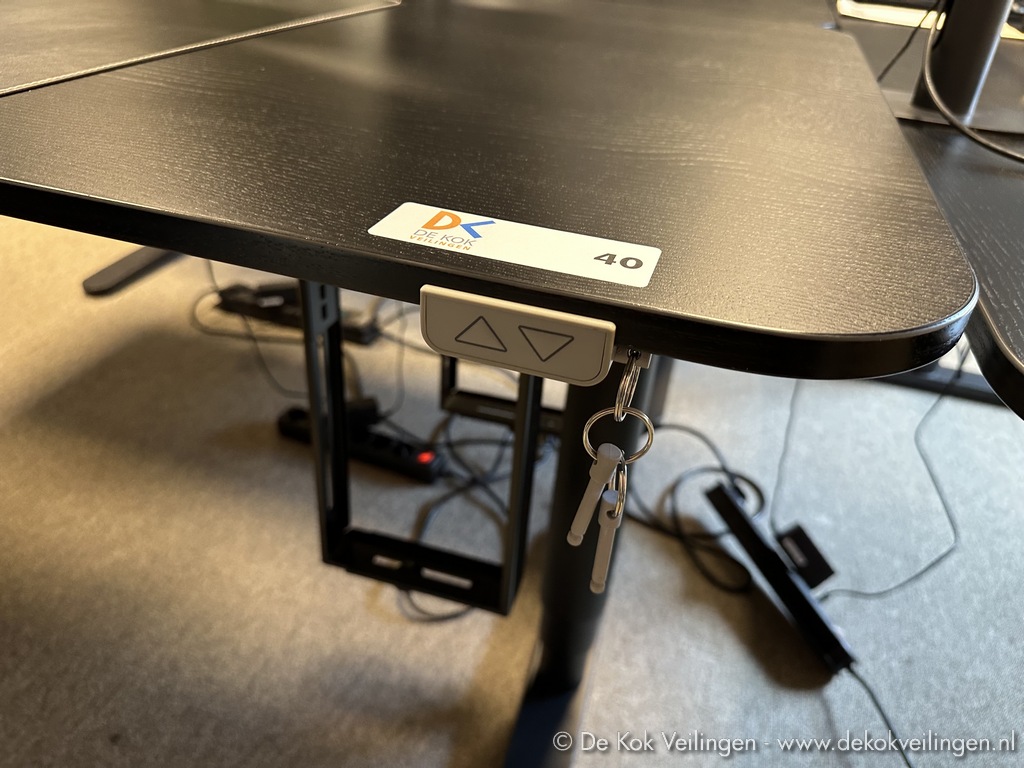 Ikea BEKANT elektrisch zit-sta bureau, Zwart gebeitst essenhout blad, 160x80 cm., inclusief kabelnet, computerbeugel, bureaumat met documentenklem en stekkerblok