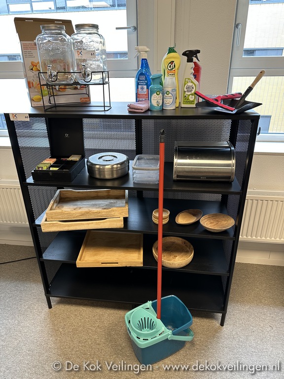 Assortiment divers, o.m. schoonmaakspullen, dienbladen, dubbele drankdispenser, theedoos, etc.